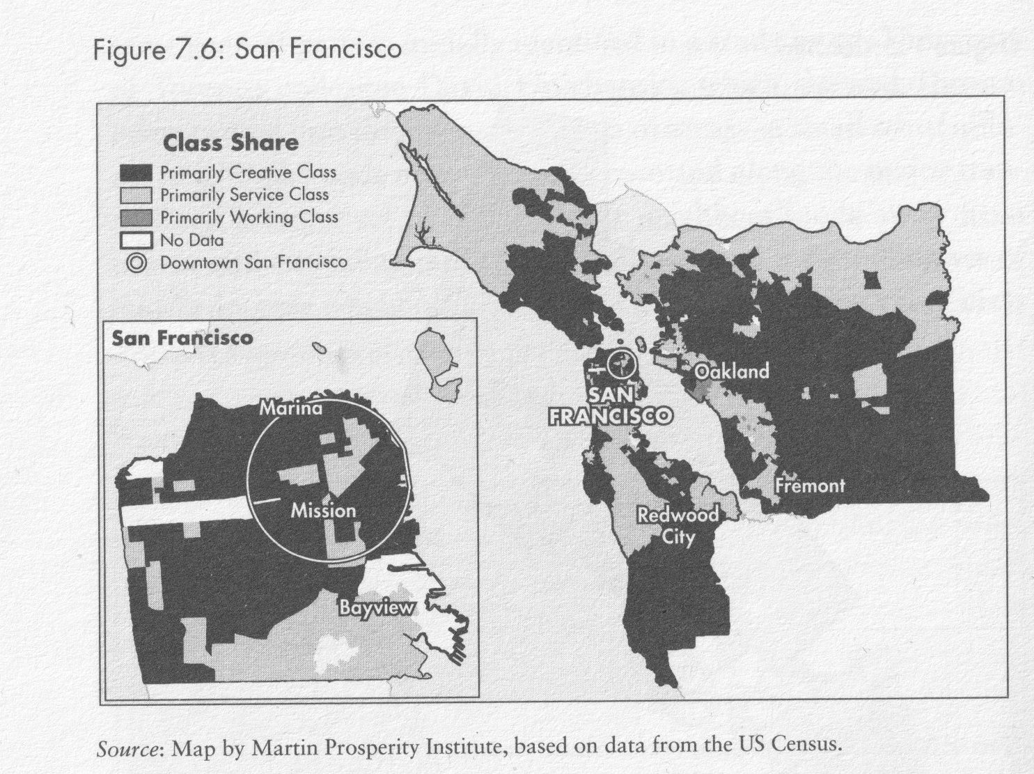 Creative Class ist ein sehr charmanter Begriff, der nicht nur klassisch kreative Tätigkeiten umfasst. Florida bezog die sog. Creative Class Professionals ein, “to include people in science and engineering, architecture and design, education, arts, music and entertainment whose economic function is to create new ideas, new technology, and new creative content” (2002, S. 8; genaue Definitionen 2017, S. 231) – so zählen auch Finanzwirtschaft, Rechtsdienstleistungen und Verwaltungsposten zur Creative Class letztlich also das, was man insgesamt als wissensbasierte Dienstleistungen zusammenfasst. Die Abgrenzung überschneidet sich weitgehend mit dem Neuen Mittelstand bei Andreas Reckwitz. Dieser “kreativen” Klasse stehen Working Class (die bluecollar old economy) und Service Class ( von der Pflege bis zur Sicherheit) gegenüber.